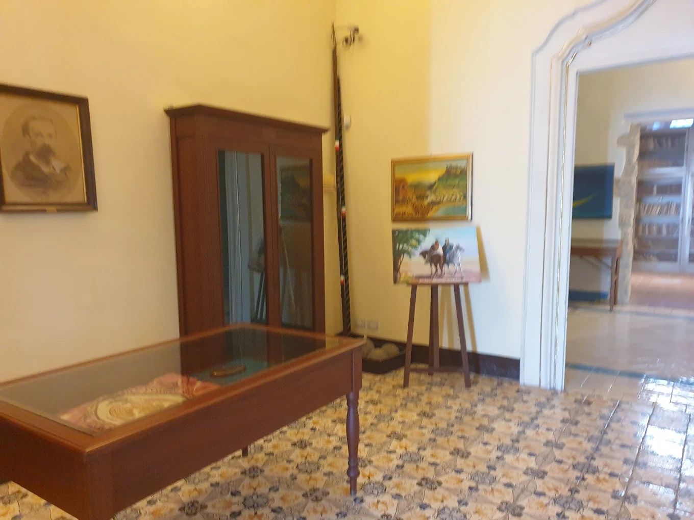 Nei locali del piano nobile, ben climatizzati, sono esposti alcuni cimeli risorgimentali, tra i quali spiccano lo scrittoio ed il letto utilizzati da Giuseppe Garibaldi nella vicina Merì alla vigilia della storica battaglia di Milazzo del 20 luglio 1860. Interessanti anche un quadro di Menotti Bruno (1898) raffigurante il patriota sen. Domenico Piraino, un ritratto ottocentesco di Giuseppe Garibaldi recentemente restaurato ed un busto marmoreo di Umberto I, opera dello scultore milazzese Francesco Greco (1881).