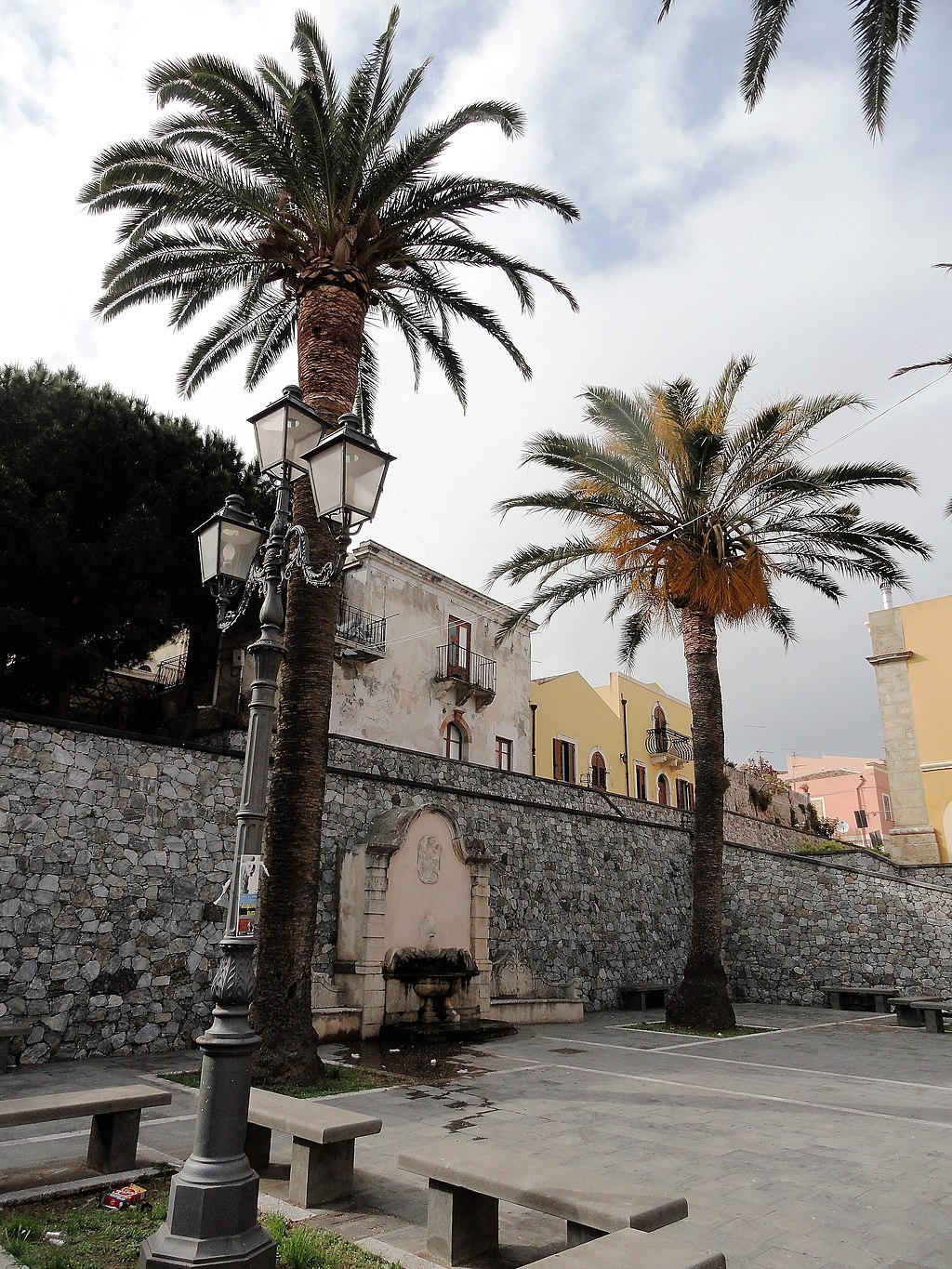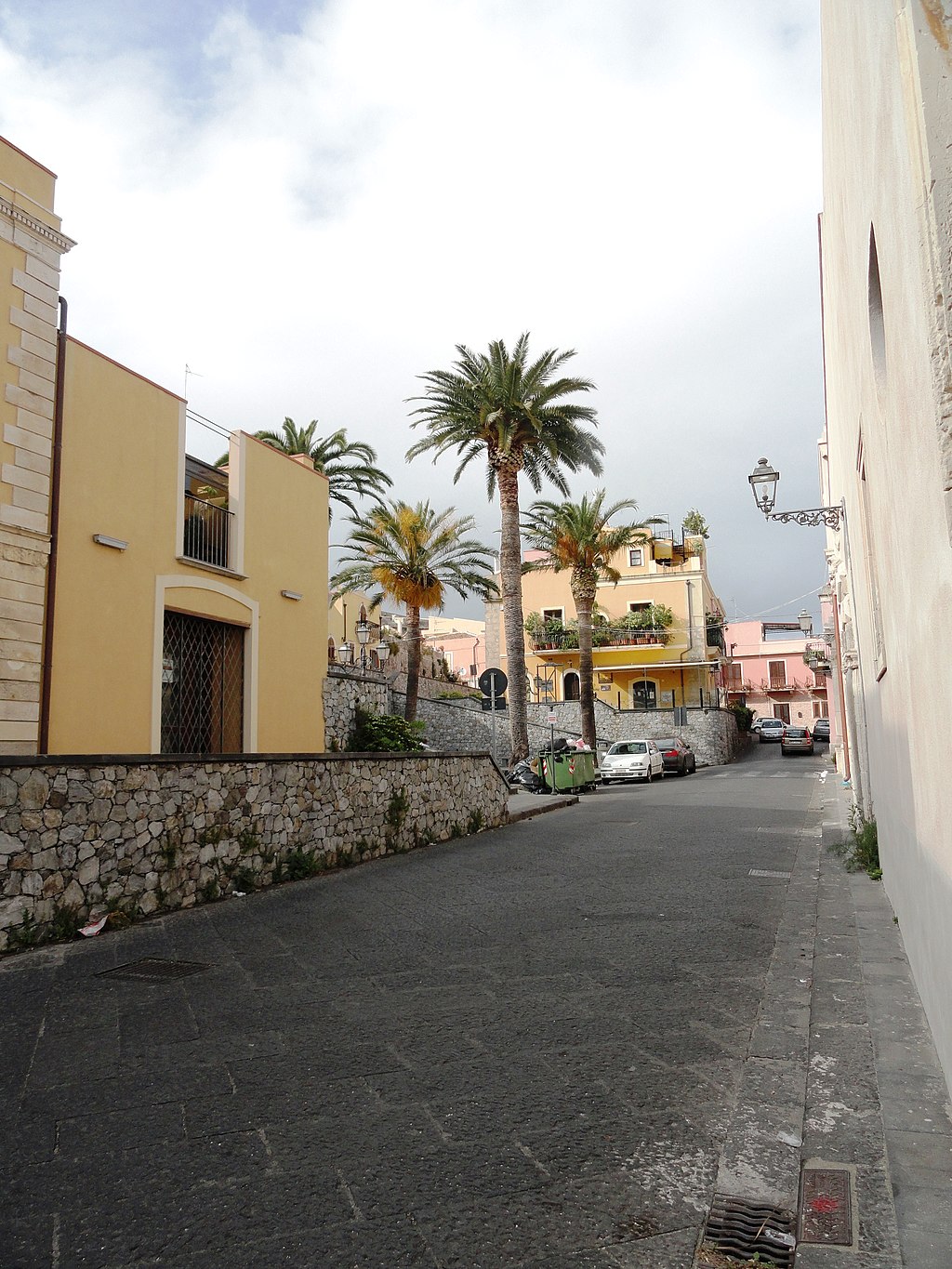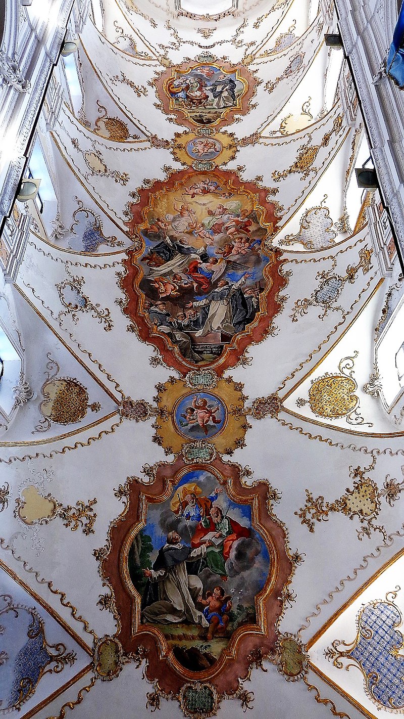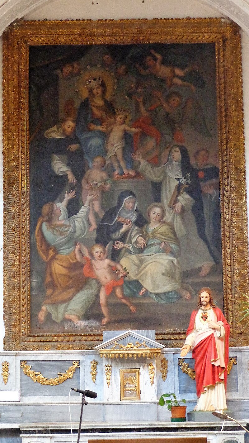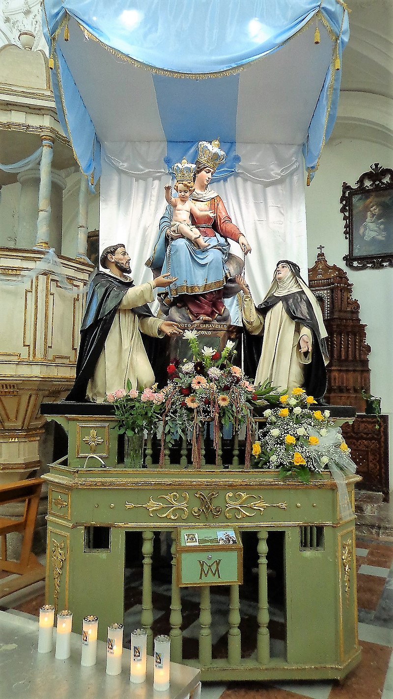 Percorrendo la via S. Giuseppe si giunge alla chiesa del Rosario, parte integrante del vasto convento di S. Domenico fondato, come la stessa chiesa, nel XVI sec. La semplice facciata del tempio fronteggia la scalinata che conduce all’ingresso principale della città murata. La chiesa, a tre navate separate da colonne, è sormontata da un elegante ciclo di affreschi firmato e datato (Domenico Giordano, 1789) e custodisce al proprio interno antiche e pregevoli opere pittoriche (qualcuna attribuita a Filippo Jannelli), tra le quali il quadro – un tempo nella chiesa dei Cappuccini – raffigurante la Madonna degli Abbandonati («Nuestra Senora de los desanparados de Valencia»), donata da alcuni cittadini spagnoli di Valenzia in servizio nella fortezza di Milazzo nel Seicento. Pregevole un paliotto ligneo dipinto in azzurro ed oro recante lo stemma della nobile famiglia Cumbo. L’aula della chiesa è impreziosita da lapidi marmoree sepolcrali munite di stemmi ed iscrizioni, da un coro ligneo e, tra l’altro, da un sarcofago marmoreo risalente al 1625. Si conserva altresì la statua della Madonna del Rosario, che ad ottobre viene condotta in processione: è stata realizzata dall’artista Luigi Guacci di Lecce nei primi decenni del Novecento.
