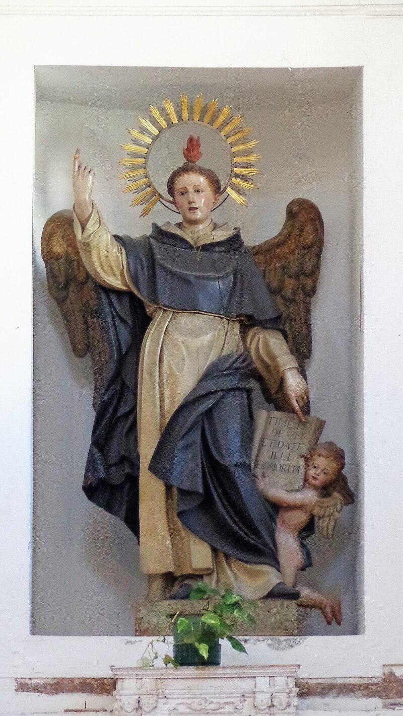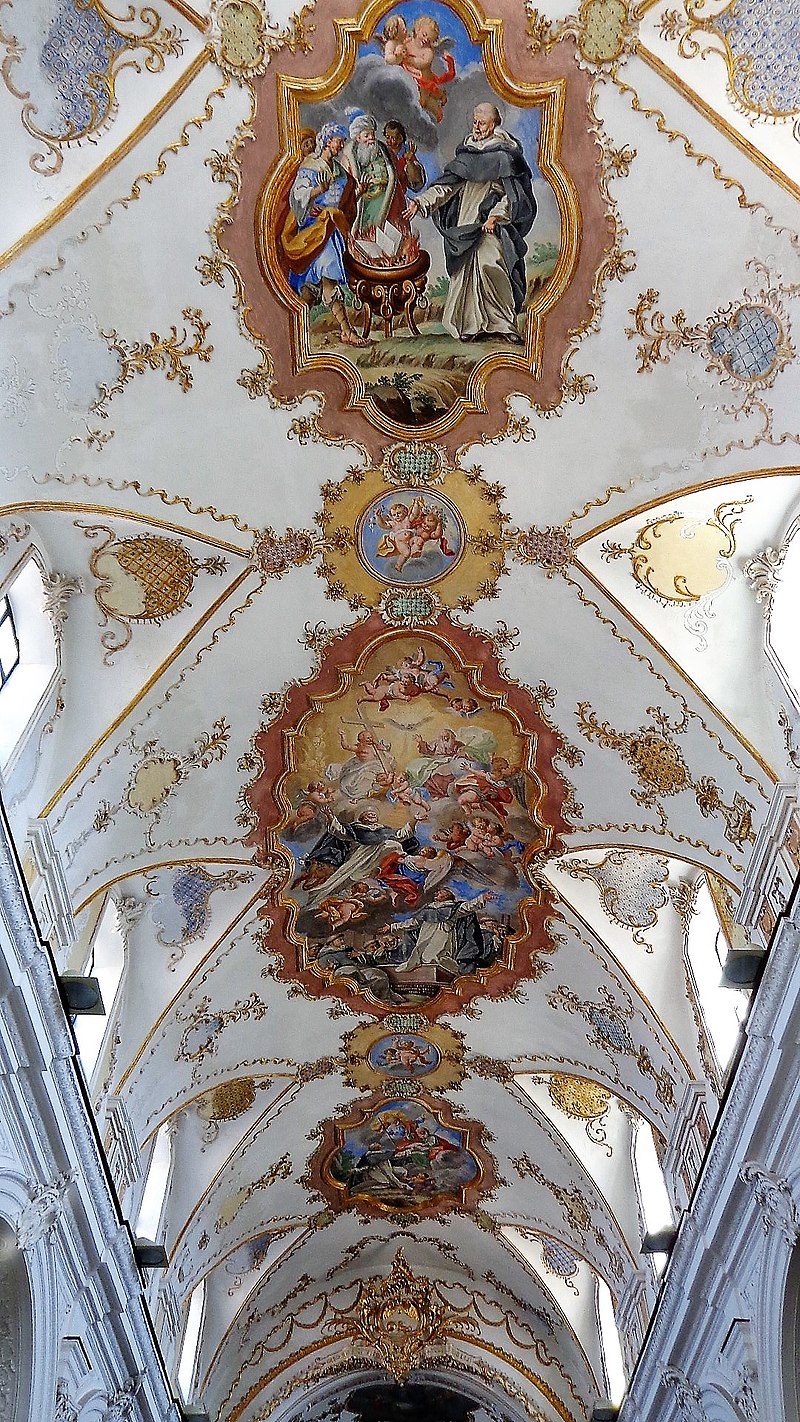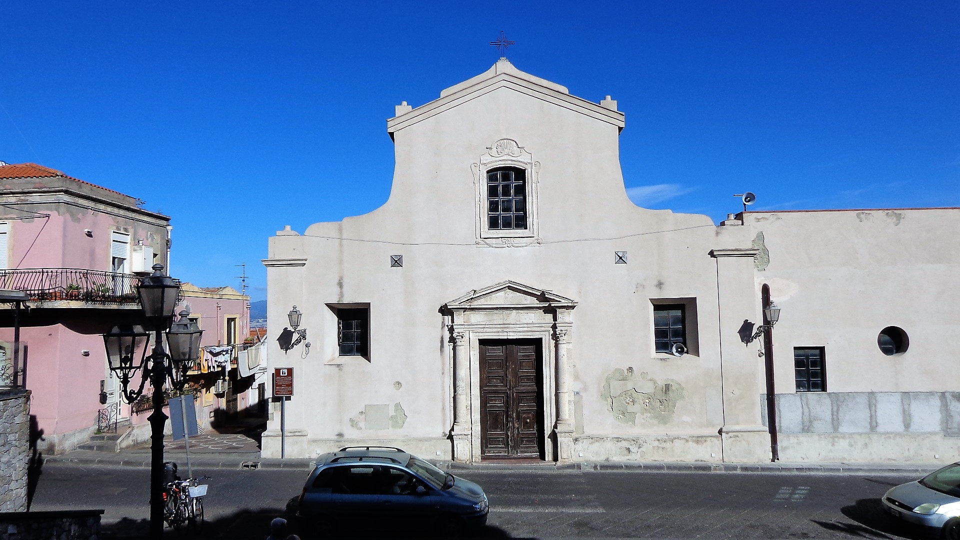 Per la sua costruzione si rese necessario abbattere la quattrocentesca chiesa di S. Leonardo e la sua ultimazione, curata dall’architetto dell’ordine dei predicatori fra Antonio Frini e finanziata dalla città e dal regio patrimonio, si protrasse sino al 1580, con ulteriori lavori di perfezionamento, consolidamento ed abbellimento, che interessarono persino il primo trentennio del secolo successivo. Il disegno della facciata è semplice e severa espressione dei canoni cinquecenteschi. Vi si colloca appieno il portale che poggia su due semicolonne con capitelli corinzi dal timpano manieristico dalle doppie linee sovrapposte ed integrate con dei labbri aggettanti. Nella parte superiore del prospetto di taglio tardo-rinascimentale, si apriva un grande loculo, poi sostituito nel 1705, da un’elegante finestra rettangolare. L’ingresso era a sua volta fiancheggiato da due alti loculi minori. Nel 1790 fu operata l’ennesima alterazione con le due finestre rettangolari prive di cornice. Le piccole vele che raccordano le due sezioni del prospetto sono una piccola testimonianza delle due grandi volte ornamentali esistenti sino ai restauri settecenteschi, che inquadravano il frontone. Ai due estremi, su due piccoli basamenti, si elevano due pigne in pietra di disegno tardo barocco. Il portale laterale ha sostituito nel 1705 una più modesta architettura a banda larga.