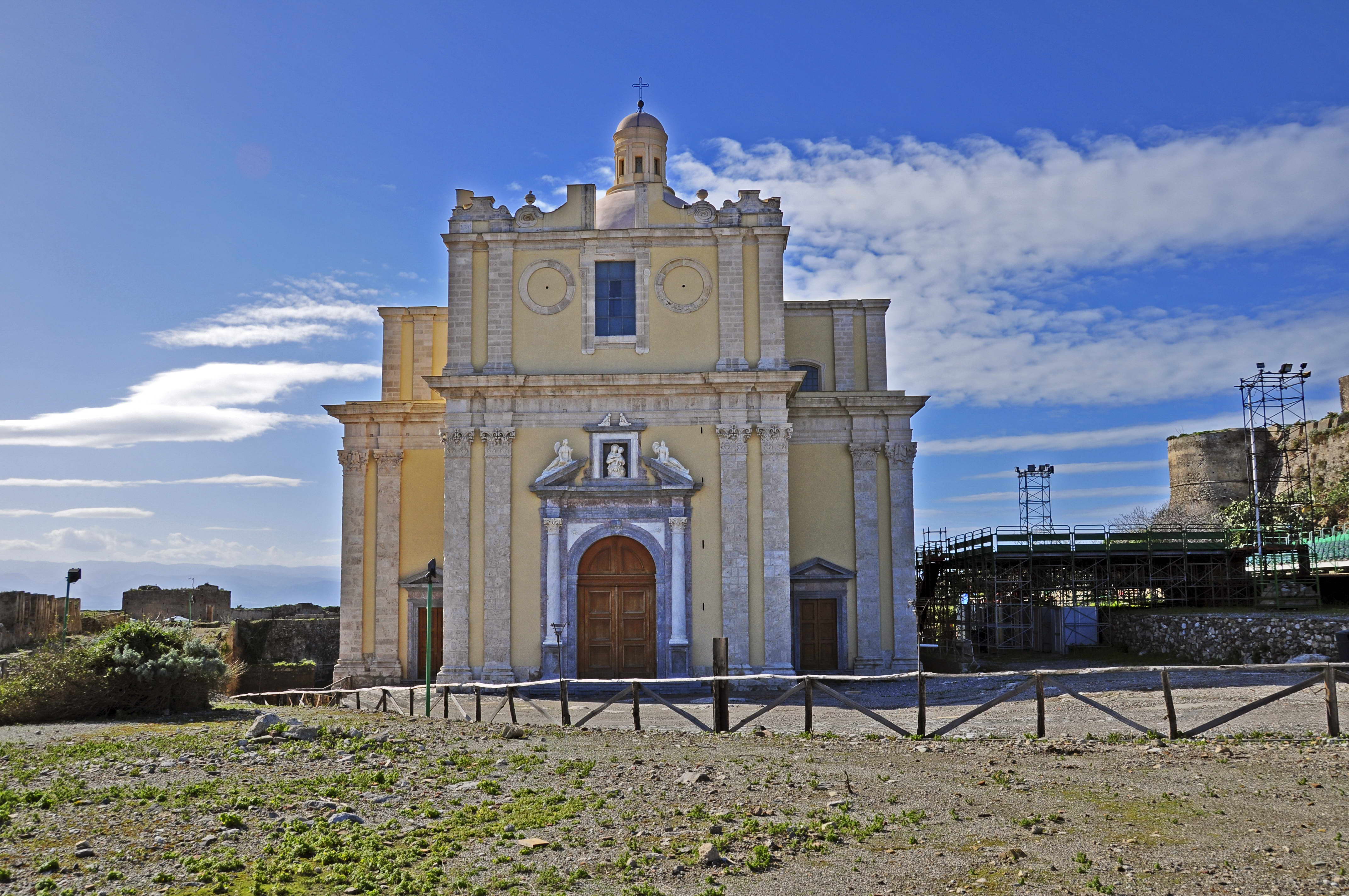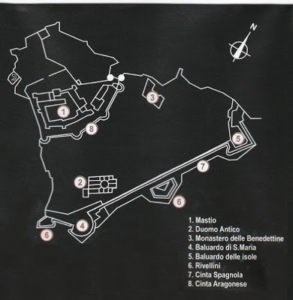 Con la costruzione della cortina cinquecentesca (cosiddetta cinta spagnola) l’intero complesso fortificato assunse la fisionomia di una vera e propria città murata, entro la quale erano ubicati i palazzi del potere, dalle sede municipale agli uffici giudiziari, cinque-sei edifici di culto, oltre alla chiesa madre innalzata alle soglie del Seicento, e le numerosissime abitazioni civili di coloro i quali dimoravano all’interno della stessa città murata. Un complesso di fabbricati pubblici e privati del quale oggi, se si eccettuano l’antico duomo e la secentesca badia benedettina, non rimangono altro che i perimetri murari di base, solo in parte affioranti in superficie.